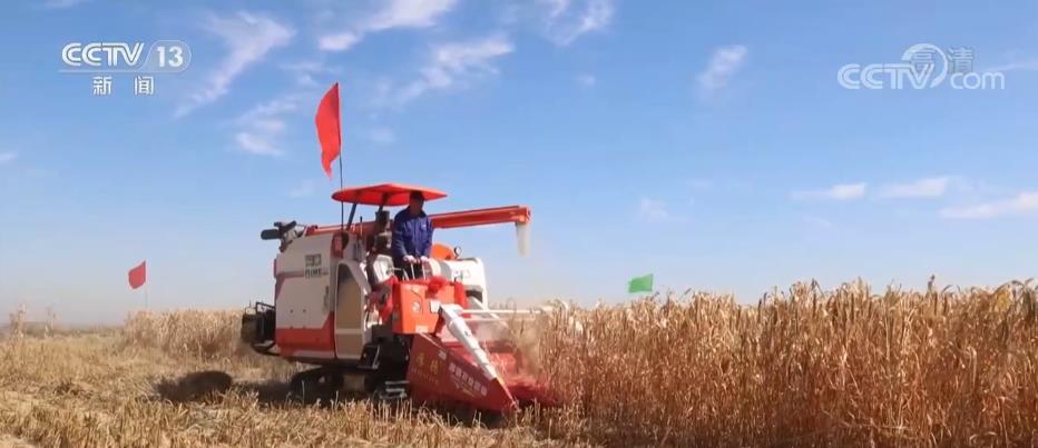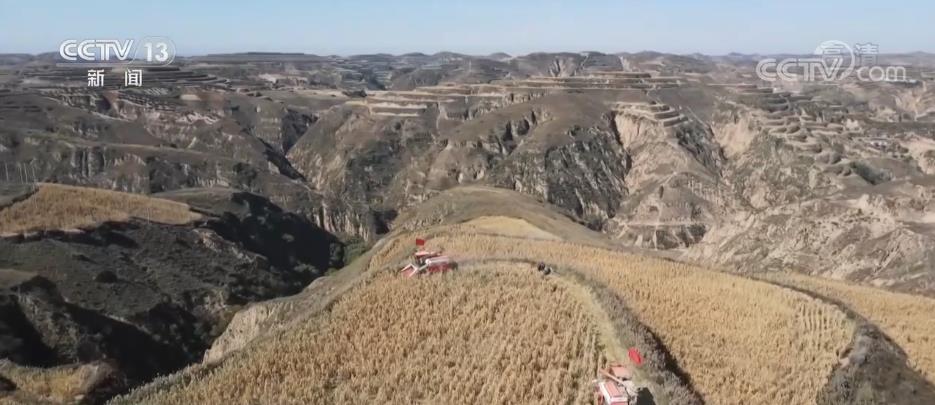 在米脂縣萬(wàn)畝高標(biāo)準(zhǔn)農(nóng)田里,收割機(jī)在谷田里來(lái)回穿梭,保證顆粒歸倉(cāng)。今年,當(dāng)?shù)赜晁渑妫人胱蚜o枬M(mǎn)、長(zhǎng)勢(shì)喜人,預(yù)計(jì)今年谷子畝產(chǎn)將達(dá)到800斤,每畝較去年增收900到1000元。