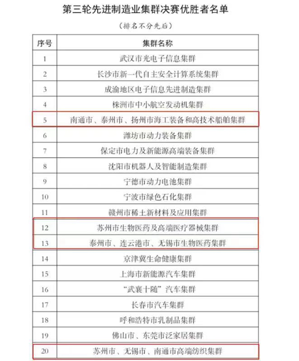 自2019年啟動(dòng)先進(jìn)制造業(yè)集群培育工作以來,工信部圍繞新一代信息技術(shù)、高端裝備、新材料、生物醫(yī)藥等重點(diǎn)領(lǐng)域,搭建集群間相互比拼的“賽場(chǎng)”。此次江蘇入選的先進(jìn)制造業(yè)集群分別是:南通市、泰州市、揚(yáng)州市海工裝備和高技術(shù)船舶集群,蘇州市生物醫(yī)藥及高端醫(yī)療器械集群,泰州市、連云港市、無錫市生物醫(yī)藥集群,蘇州市、無錫市、南通市高端紡織集群。
