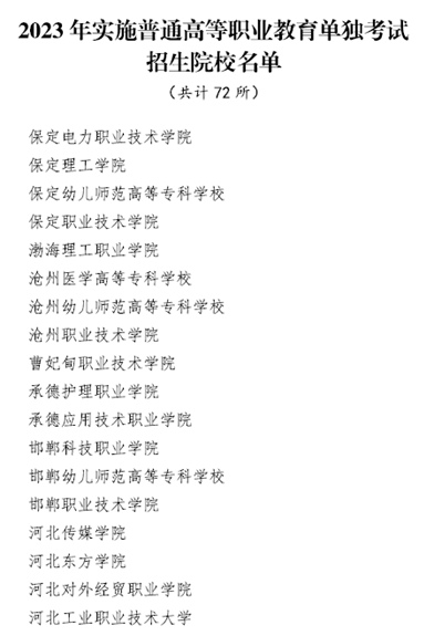 人民網(wǎng)石家莊12月3日電 (楊文娟)近日,河北省教育廳印發(fā)了關(guān)于做好2023年普通高等職業(yè)教育單獨考試招生工作的通知。通知明確,2023年高職單招采取統(tǒng)考計劃和對口計劃分開編列的方式進行,河北實施高職單招院校共計72所。
