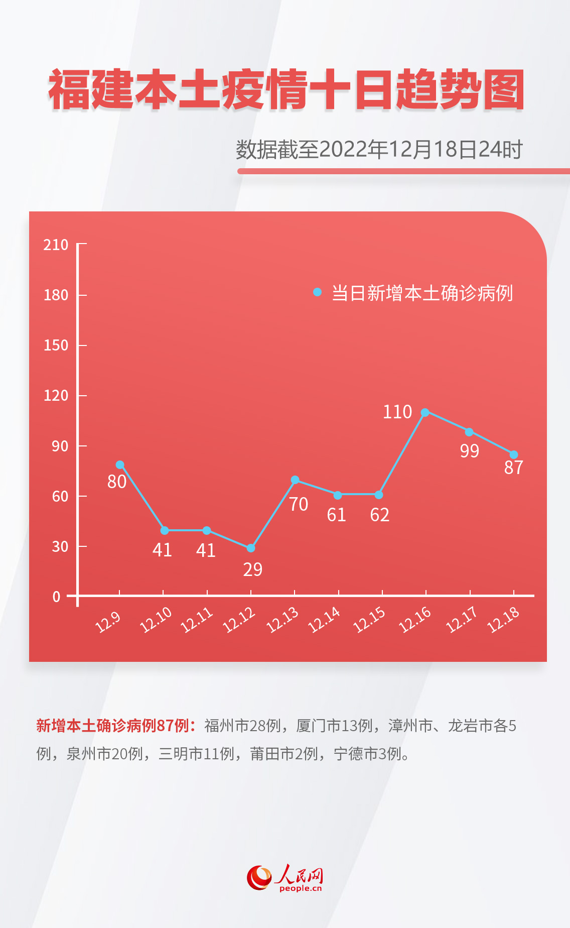 人民網(wǎng)福州12月19日電 (江葦杭、陳永整)據(jù)福建省衛(wèi)健委網(wǎng)站消息,12月18日0-24時(shí),福建省報(bào)告新增本土確診病例87例(福州市28例,廈門市13例,漳州市、龍巖市各5例,泉州市20例,三明市11例,莆田市2例,寧德市3例)。目前,全省本土確診病例住院563例,無(wú)死亡病例。