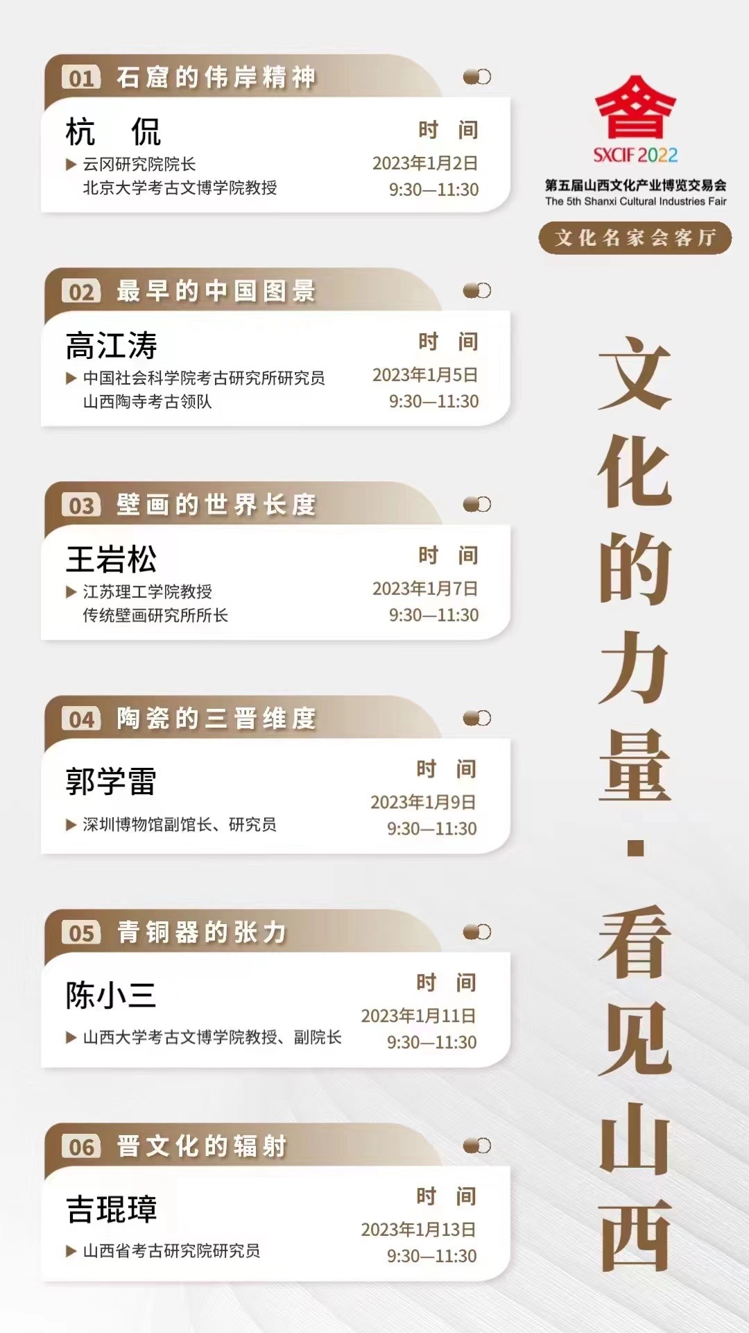 山西歷史悠久,文化資源深厚,在豐富的歷史遺存里,留存有無數(shù)山西智慧、山西力量。本次“文化名家會客廳”就是以“文化的力量·看見山西”為主題,從組成山西文化的文博、考古元素入手,邀請6位在全國有影響的專家進行線上講座,以各自不同的空間和文化視角,分列主題,對山西文化資源進行分析觀照,探討如何更好、更深、更有效地發(fā)掘當(dāng)下有利于彰顯山西文化的優(yōu)質(zhì)要素,助力山西文化事業(yè)高質(zhì)量發(fā)展。