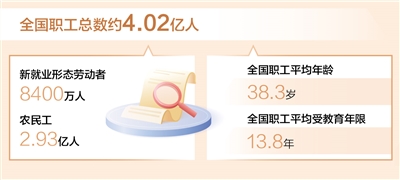 本報北京3月26日電 (記者易舒冉)記者日前從中華全國總工會獲悉:第九次全國職工隊(duì)伍狀況調(diào)查已于近期結(jié)束,調(diào)查表明,目前全國職工總數(shù)4.02億人左右,新就業(yè)形態(tài)勞動者8400萬人,農(nóng)民工2.93億人;職工平均年齡38.3歲、平均受教育年限13.8年。調(diào)查還顯示,職工理想信念更加堅(jiān)定,主人翁地位持續(xù)鞏固,越來越多的職工積極投身“當(dāng)好主人翁、建功新時代”“建功‘十四五’、奮進(jìn)新征程”等主題勞動和技能競賽。