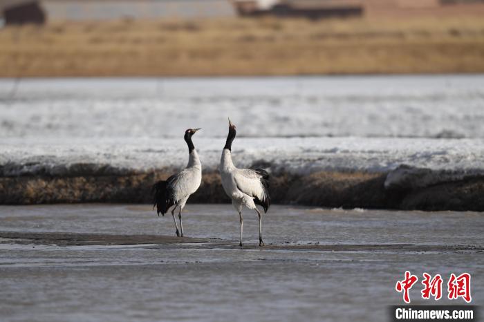 圖為一對(duì)成體黑頸鶴在黨河濕地嬉戲。(資料圖) 受訪者供圖