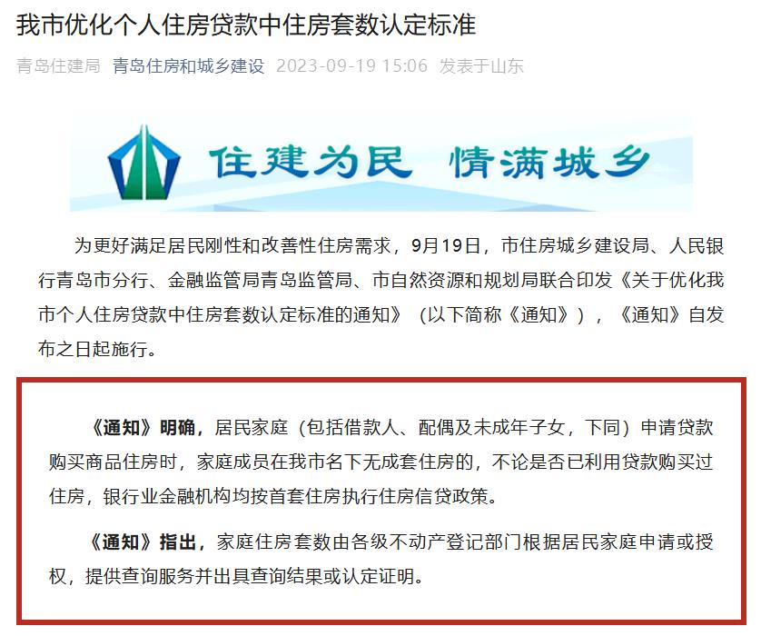 人民網(wǎng)濟(jì)南9月20日電 為更好滿足居民剛性和改善性住房需求,9月19日,青島市住房城鄉(xiāng)建設(shè)局、人民銀行青島市分行、金融監(jiān)管局青島監(jiān)管局、市自然資源和規(guī)劃局聯(lián)合印發(fā)《關(guān)于優(yōu)化我市個(gè)人住房貸款中住房套數(shù)認(rèn)定標(biāo)準(zhǔn)的通知》(以下簡(jiǎn)稱《通知》),《通知》自發(fā)布之日起施行。