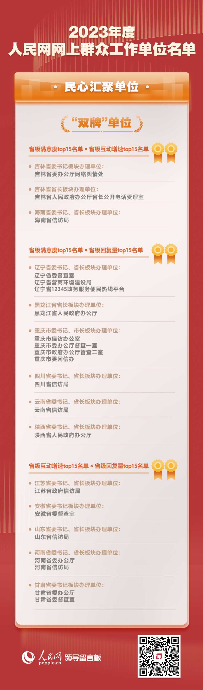 此次公布的名單綜合全國各地區(qū)各部門各單位近一年來的滿意度、互動增速、回復量等指數(shù),著重突出各地區(qū)各部門各單位依托人民網(wǎng)“領(lǐng)導留言板”開展網(wǎng)上群眾工作情況,選出2023年度人民網(wǎng)網(wǎng)上群眾工作“民心匯聚單位”“實干擔當單位”“匯智為民單位”和“活力奮進單位”。