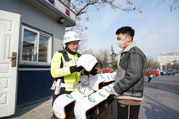 群眾在掃碼借用“共享頭盔”時,系統(tǒng)自動推送交通安全宣傳提示信息,實現(xiàn)借用一次頭盔、接受一次教育。(張晉 田廷江)
