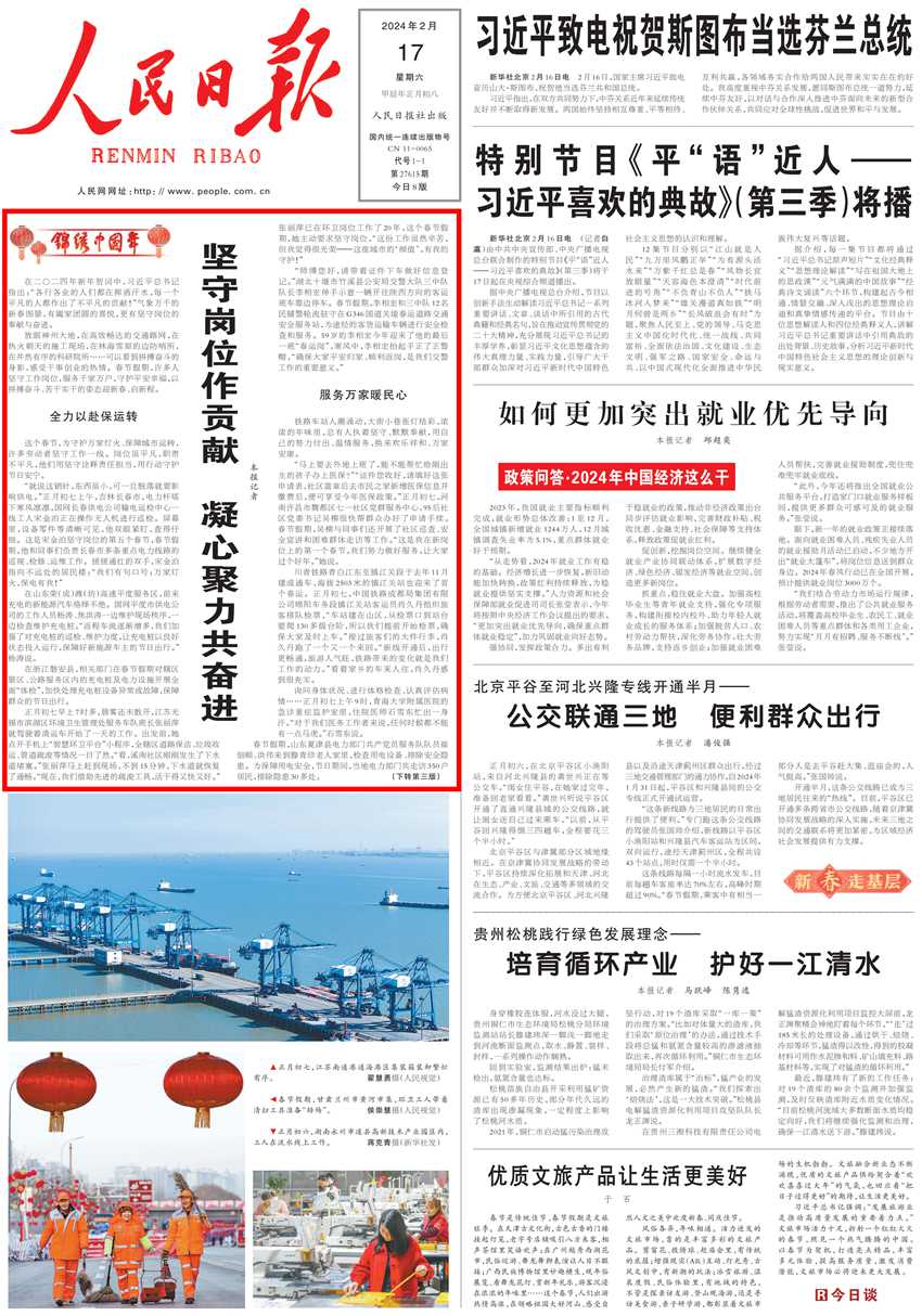 在二〇二四年新年賀詞中,習(xí)近平總書記指出:“各行各業(yè)的人們都在揮灑汗水,每一個平凡的人都作出了不平凡的貢獻(xiàn)!”氣象萬千的新春圖景,有闔家團(tuán)圓的喜悅,更有堅守崗位的奉獻(xiàn)與奮進(jìn)。