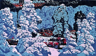 充滿粗獷刀味和雄渾之氣的色塊構成,是晁楣版畫的魅力所在。他的藝術風格從何而來?答案源于其在創(chuàng)作實踐中的自我體悟。在藝術創(chuàng)作中,晁楣深刻把握了藏與露、簡與繁、整體與局部等多對概念之間的對立統(tǒng)一關系。與以人為主要表現(xiàn)對象的傳統(tǒng)黑白木刻有所不同,他的套色木刻以北大荒雄渾壯闊的風景為主要題材。大色塊的構成可以鮮明地表現(xiàn)山川、樹木的色彩關系,遠景的人物因形象被縮小,化作外形概括的色塊,為畫面提供了精彩的細節(jié)。如《北方九月》《戰(zhàn)油?!贰都t裝素裹》《秋歌》《松谷》等作品,皆是在鳥瞰式的場景中以大色塊鋪陳畫面,再將人、鷹、馬、車等物象轉化為斑斕的色塊點綴其中,使得作品既有宏觀的場景表現(xiàn),亦有微觀的敘事呈現(xiàn),兩者相得益彰、相映成趣,呈現(xiàn)出濃郁的個人創(chuàng)作風格。