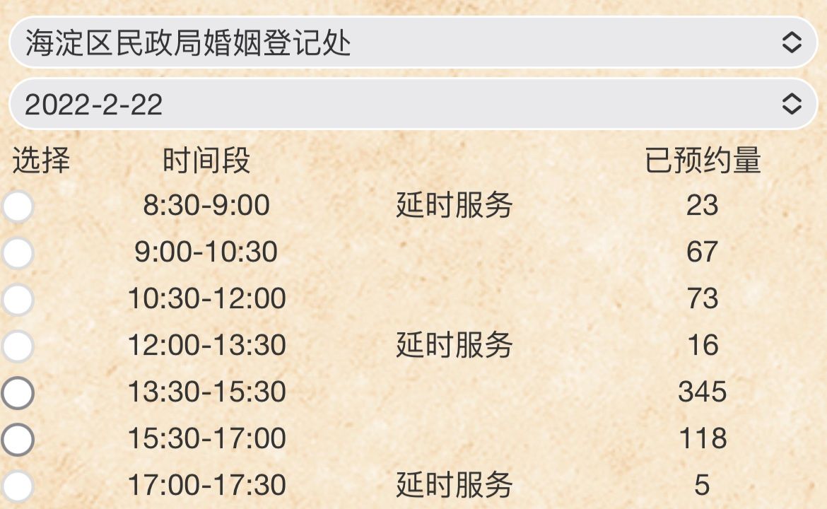 新人登記領證總想討個好彩頭,2月22日被網(wǎng)友稱為“充滿愛的日子”,受到追捧。記者通過北京市婚登系統(tǒng)查詢發(fā)現(xiàn),各區(qū)在2月22日預約婚姻登記十分火爆,多個時段出現(xiàn)滿額情況。