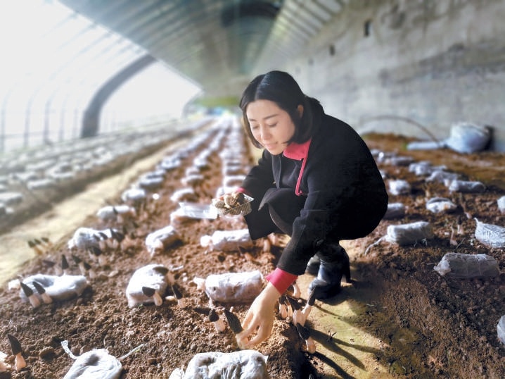 一頭利落的短發(fā),筆挺的身姿,明亮的笑容,39歲的董偉給人的第一印象有點颯。跟隨她來到位于懷柔區(qū)廟城鎮(zhèn)王史山村的溫室大棚,只見一個個小傘般的蘑菇頂蓋從土中鉆出來,看上去皺皺巴巴,筆直的菌柄呈象牙白色,村民們手持特制的小彎刀,嫻熟地將蘑菇從根部割下,不一會兒就裝滿了一筐?!斑@是羊肚菌,一種珍稀食用菌,聞起來有一股淡淡的香味?!闭f起蘑菇種植,董偉如數(shù)家珍,“羊肚菌是低溫菇,溫度一上來就不行了,收獲已經(jīng)接近尾聲。”