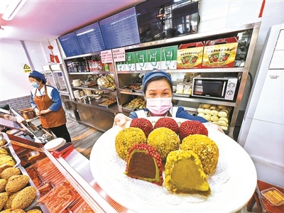 寒食節(jié)有踏青出游、放風(fēng)箏等民俗活動(dòng),護(hù)國(guó)寺小吃“寒食十三絕”中的蜜麻花,形似風(fēng)箏,有著寒食吃蜜麻花耳聰目明的寓意;而像姜汁排叉,在春寒尚未退卻之時(shí),以姜汁暖胃,加之春季宜食甜,所以也成為護(hù)國(guó)寺小吃寒食中的銷(xiāo)量冠軍。在護(hù)國(guó)寺小吃起源店,為了方便市民購(gòu)買(mǎi),護(hù)國(guó)寺小吃的“寒食十三絕”堅(jiān)持套裝售賣(mài)和零售,經(jīng)理王新梅介紹,“像里面的姜汁排叉、蜜麻花的銷(xiāo)量幾乎能占到十三絕銷(xiāo)量的四成左右,最受歡迎?!?/p>