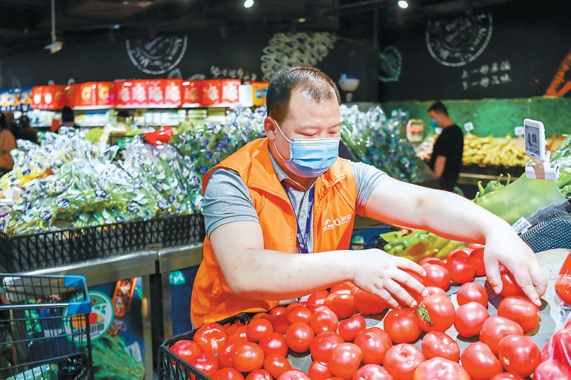 物美雙井店店長宋飛飛在賣場(chǎng)查看蔬果銷售情況。本報(bào)記者 鄧偉攝