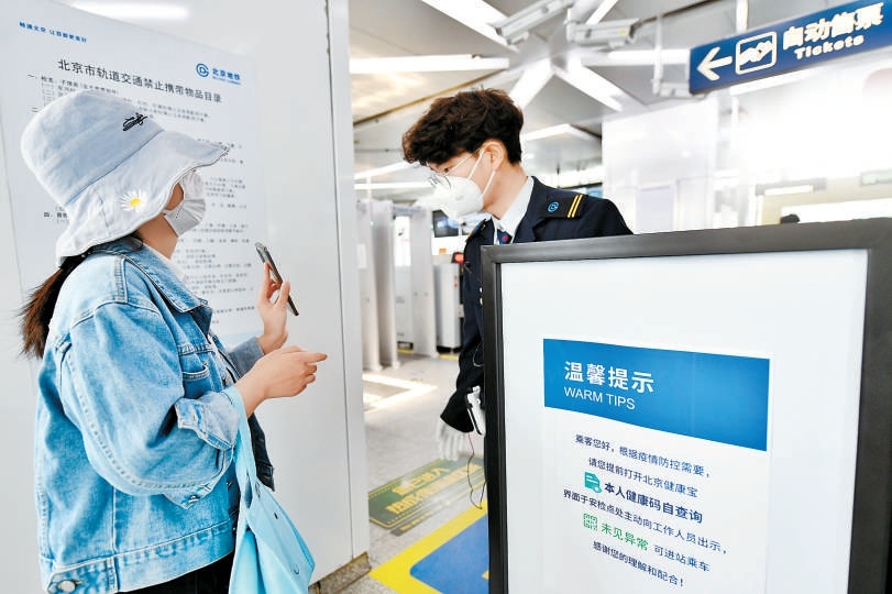 17日早晨,在北京地鐵5號線北苑路北站,地鐵安檢人員在進(jìn)站安檢口檢查乘客健康碼。本報記者 鄧偉攝