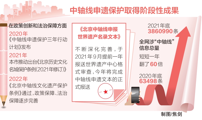 2017年,“積極推進(jìn)中軸線申遺工作”寫(xiě)入《北京城市總體規(guī)劃(2016年—2035年)》。同年,北京市推進(jìn)全國(guó)文化中心建設(shè)領(lǐng)導(dǎo)小組批準(zhǔn)成立了中軸線申遺保護(hù)專項(xiàng)工作組,全面啟動(dòng)北京中軸線申遺保護(hù)工作……