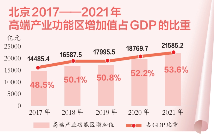 重點功能區(qū)呈現(xiàn)集聚效應(yīng)。中關(guān)村國家自主創(chuàng)新示范區(qū)等高端產(chǎn)業(yè)功能區(qū)占據(jù)全市經(jīng)濟總量的半壁江山,2021年實現(xiàn)增加值2.2萬億元,占全市GDP的53.6%,比2016年提高5.3個百分點。