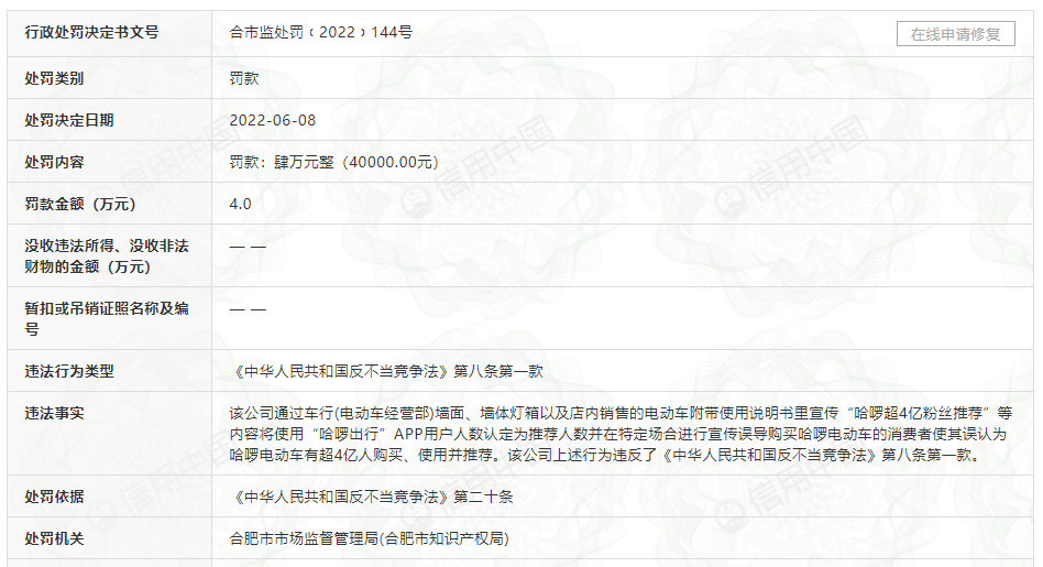 哈啰關(guān)聯(lián)公司因誤導(dǎo)消費(fèi)者被罰4萬(wàn)元:宣稱超4億粉絲推薦