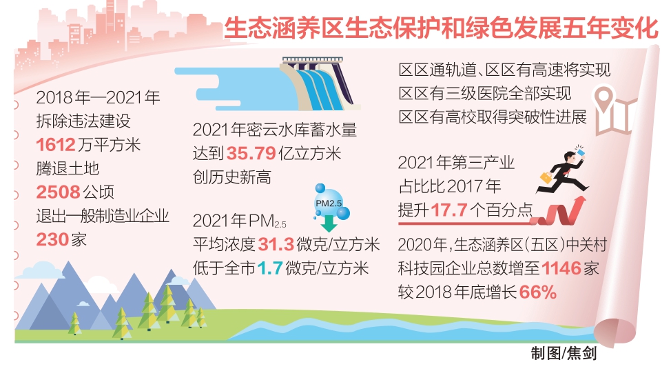 數(shù)據(jù)顯示,2018年到2021年,生態(tài)涵養(yǎng)區(qū)累計拆除違法建設(shè)1612萬平方米、騰退土地2508公頃、退出一般制造業(yè)企業(yè)230家。