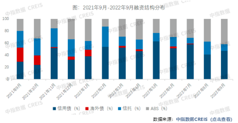 2022年1-9月,房地產企業(yè)非銀融資總額7331.5億元,同比下降52.6%。從融資結構來看,信用債占比50.2%,同比提升19.9個百分點;海外債占比僅為2.4%,同比下降14.0個百分點;信托占比16.0%,同比下降15.1個百分點;ABS占比31.4%,同比提升9.3個百分點。前三季度非銀融資總額分別占比33.1%、35.1%、32.1%,各季度融資比例差異不大,并未出現(xiàn)明顯的融資高峰期。