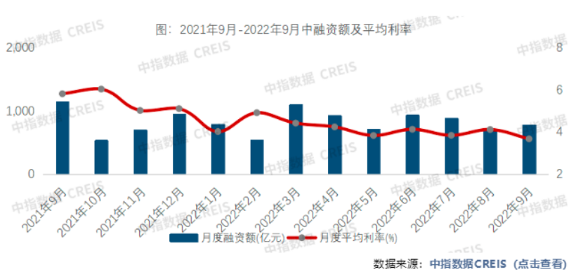 銷售業(yè)績有所回暖的同時,房企面臨的資金壓力也在有所緩解。數(shù)據(jù)顯示,9月房企融資平均利率同比出現(xiàn)下降,信用債發(fā)行出現(xiàn)回暖跡象。據(jù)中指研究院監(jiān)測,2022年9月房地產企業(yè)非銀融資總額為777.9億元,同比下降32.2%,環(huán)比上升13.3%,融資形勢稍有好轉。行業(yè)平均利率為3.67%,同比下降2.14個百分點,環(huán)比下降0.44個百分點。