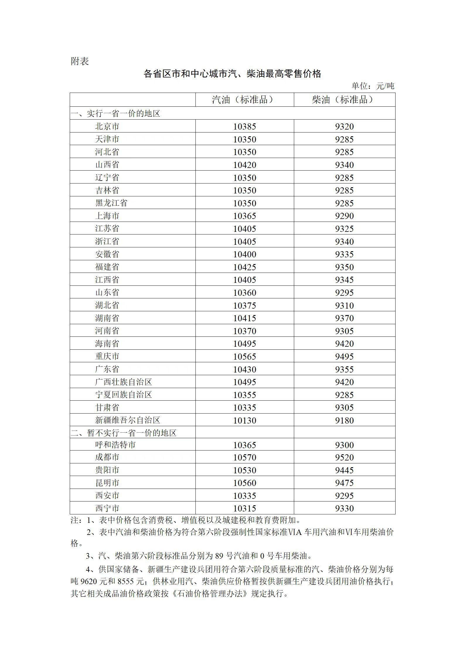 央廣網(wǎng)北京10月24日消息 據(jù)國家發(fā)展改革委官方網(wǎng)站消息,根據(jù)近期國際市場油價變化情況,按照現(xiàn)行成品油價格形成機制,自2022年10月24日24時起,國內(nèi)汽、柴油價格(標準品,下同)每噸分別提高185元和175元。調(diào)整后,各省(區(qū)、市)和中心城市汽、柴油最高零售價格見下表。相關(guān)價格聯(lián)動及補貼政策按現(xiàn)行規(guī)定執(zhí)行。