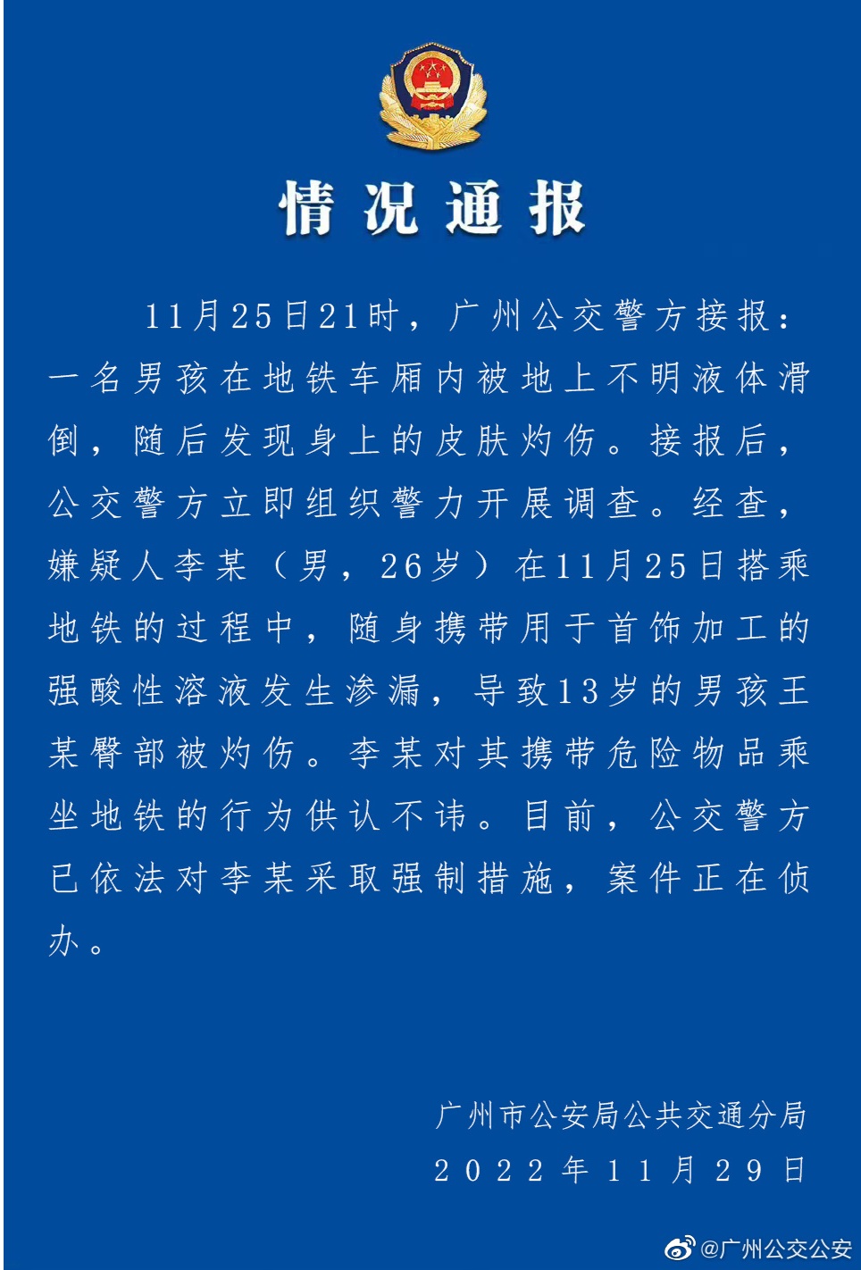 通報(bào)顯示,25日21時(shí),廣州公交警方接報(bào)稱,一名男孩在地鐵車廂內(nèi)被地上不明液體滑倒,隨后發(fā)現(xiàn)身上的皮膚灼傷。接報(bào)后,公交警方立即組織警力開(kāi)展調(diào)查。經(jīng)查,嫌疑人李某(男,26歲)在11月25日搭乘地鐵的過(guò)程中,隨身攜帶用于首飾加工的強(qiáng)酸性溶液發(fā)生滲漏,導(dǎo)致13歲的男孩王某臀部被灼傷。李某對(duì)其攜帶危險(xiǎn)物品乘坐地鐵的行為供認(rèn)不諱。
