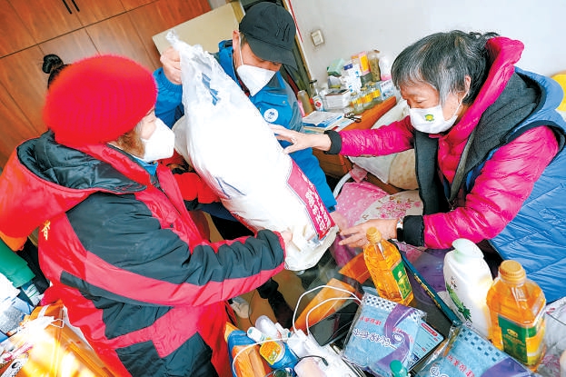 昨天,在龍?zhí)督值佬腋I鐓^(qū)養(yǎng)老服務(wù)驛站,“夕陽手拉手互助團”和“小棉襖愛老”的志愿者們,將愛心物資送到社區(qū)養(yǎng)老家庭照護床位的老人手中。疫情下,老年群體更加需要關(guān)注與關(guān)愛,志愿者們以需求為導(dǎo)向,精準(zhǔn)服務(wù)老年人。 本報記者 方非攝