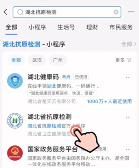 1.首先打開(kāi)支付寶,搜索“湖北抗原檢測(cè)”,點(diǎn)擊“湖北省抗原檢測(cè)官方小程序”,進(jìn)入“個(gè)人檢測(cè)上報(bào)”。