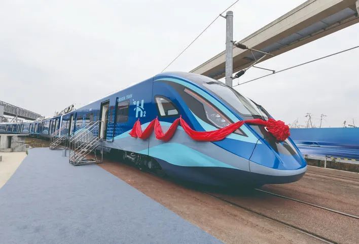 由中車長春軌道客車股份有限公司聯(lián)合成都軌道集團共同研制的全球首列氫能源市域列車在成都下線。(央廣網(wǎng)發(fā) 中車長客供圖)
