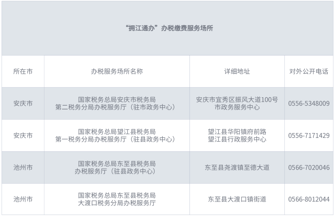 2.通辦場所。1.國家稅務(wù)總局安慶市稅務(wù)局第二稅務(wù)分局辦稅服務(wù)廳(駐市政務(wù)中心);2.國家稅務(wù)總局望江縣稅務(wù)局第一稅務(wù)分局辦稅服務(wù)廳(駐縣政務(wù)中心);3.國家稅務(wù)總局東至縣稅務(wù)局辦稅服務(wù)廳(駐縣政務(wù)中心);4.國家稅務(wù)總局東至縣稅務(wù)局大渡口稅務(wù)分局辦稅服務(wù)廳,以上4個辦稅繳費場所均可辦理“擁江通辦”事項,辦稅繳費場所詳見附件1。