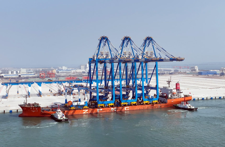 載運著3臺超大型集裝箱碼頭岸橋和1臺軌道吊的特種運輸船“振華31”輪安全靠泊欽州港。