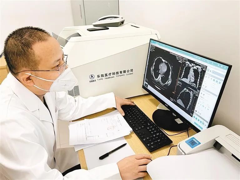10日上午,在杜城社區(qū)衛(wèi)生服務(wù)中心診室門(mén)前,等候拍片的患者不多。在工作人員引導(dǎo)下,大家有序進(jìn)入拍攝區(qū)。診室內(nèi),陜西省康復(fù)醫(yī)院影像一科主任高雅鵬正在一個(gè)看似與普通顯示器沒(méi)什么兩樣的電腦前書(shū)寫(xiě)診斷報(bào)告?!氨绕鹨话愕腃T靜態(tài)閱片,在這臺(tái)顯示器的幫助下,我們可以實(shí)現(xiàn)多角度、多方位、動(dòng)態(tài)式閱片,讓診斷更加細(xì)致精準(zhǔn)?!?高雅鵬說(shuō),這臺(tái)CT機(jī)的配置完全可以滿足周邊居民對(duì)于肺部CT的拍片需求。