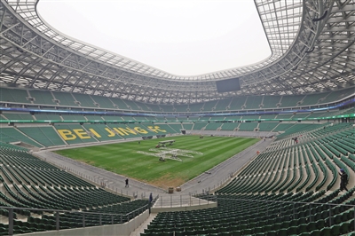 走進(jìn)新工體項(xiàng)目區(qū)域,清灰色外立面的工人體育場在陽光下熠熠生輝,綠茵賽場整裝待發(fā),看臺上環(huán)繞著寫有“北京國安”的綠色燈條。