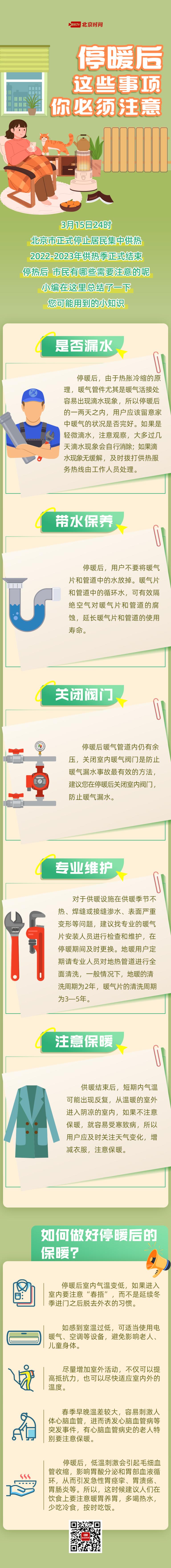 今日(16日)起,北京市正式停止居民集中供熱,都有哪些注意事項(xiàng)?首先要做好供熱設(shè)備的維護(hù),包括及時(shí)檢測暖氣管道是否漏水,不要放掉暖氣管道中的水,停暖后及時(shí)關(guān)閉室內(nèi)閥門并安排專業(yè)人員對供暖設(shè)施進(jìn)行維護(hù)和清洗。在停暖后還需注意保暖,如注意“春捂”,增加室外活動(dòng),注重心血管和腸胃的保暖,避免早晚溫差刺激。停暖知識帖來了,戳圖了解→