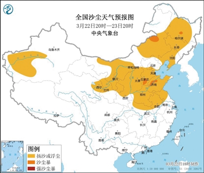 中央氣象臺昨日18時繼續(xù)發(fā)布沙塵暴黃色預(yù)警,受冷空氣大風(fēng)影響,預(yù)計22日20時至23日20時,新疆西南部、內(nèi)蒙古中西部和東南部、青海東北部、甘肅中部、寧夏、陜西中北部、山西、河北中南部、北京南部、天津中南部、山東、河南、安徽中北部、江蘇中北部、湖北北部、黑龍江中西部、吉林中西部、遼寧等地的部分地區(qū)有揚沙或浮塵天氣,其中,內(nèi)蒙古中部偏北地區(qū)、黑龍江南部、河北西南部、山東西部局地有沙塵暴。