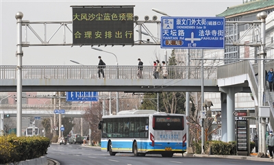 3月22日,天壇路,電子顯示屏提示,大風(fēng)沙塵藍(lán)色預(yù)警,合理安排出行。新京報記者 王飛 攝