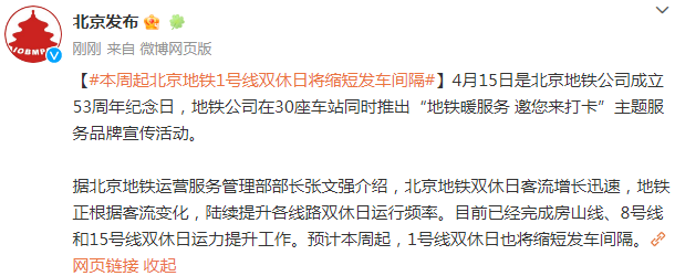 據(jù)北京地鐵運(yùn)營(yíng)服務(wù)管理部部長(zhǎng)張文強(qiáng)介紹,北京地鐵雙休日客流增長(zhǎng)迅速,地鐵正根據(jù)客流變化,陸續(xù)提升各線路雙休日運(yùn)行頻率。目前已經(jīng)完成房山線、8號(hào)線和15號(hào)線雙休日運(yùn)力提升工作。預(yù)計(jì)本周起,1號(hào)線雙休日也將縮短發(fā)車(chē)間隔。