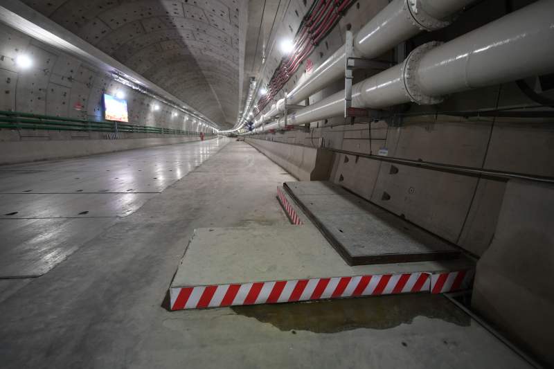 此外,箱涵兩側(cè)分別設(shè)置有管廊與人員應(yīng)急通道,而這些在路面鋪設(shè)完畢后都將藏于路面下方,對通行者來說完全是無感的。孫長松指著路面上的一處蓋有擋板的地方告訴記者,這里就是人員應(yīng)急通道的入口,通車后路面上將設(shè)置用液壓控制的智能蓋板,正常狀態(tài)下,它與路面嚴(yán)絲合縫地貼在一起,在發(fā)生意外情況、需要疏散人員時(shí),它則會及時(shí)開啟。