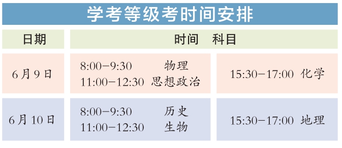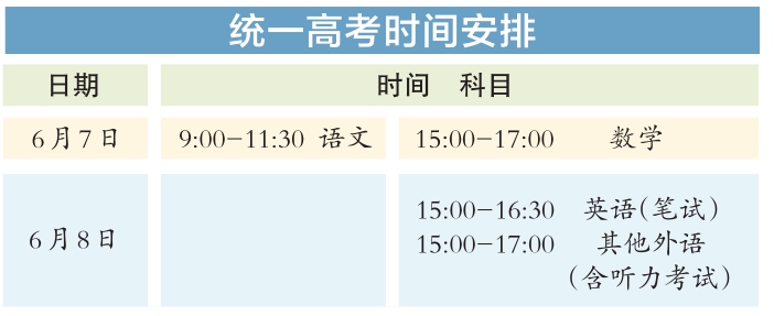 今年統(tǒng)一高考考試科目為語(yǔ)文、數(shù)學(xué)、外語(yǔ)3門(mén),滿(mǎn)分均為150分。其中,英語(yǔ)聽(tīng)說(shuō)考試滿(mǎn)分50分,其他外語(yǔ)(非英語(yǔ))聽(tīng)力考試滿(mǎn)分30分,兩次聽(tīng)說(shuō)(聽(tīng)力)考試的最高成績(jī)與其他部分試題成績(jī)一同組成外語(yǔ)科目成績(jī)計(jì)入高考總分。學(xué)考等級(jí)考科目為思想政治、歷史、地理、物理、化學(xué)、生物6門(mén),由考生自主選擇3門(mén)參加考試,每科目滿(mǎn)分100分。參加本科招生錄取的考生總成績(jī)由3門(mén)統(tǒng)一高考成績(jī)和考生選考的3門(mén)學(xué)考等級(jí)考成績(jī)構(gòu)成,總成績(jī)滿(mǎn)分值為750分。