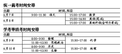 學(xué)考等級(jí)考科目為思想政治、歷史、地理、物理、化學(xué)、生物6門,由考生自主選擇3門參加考試,考試時(shí)間為6月9日至10日。