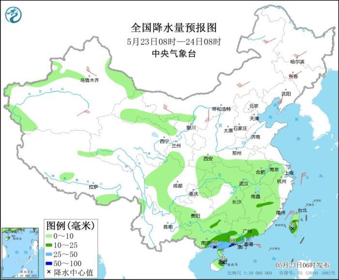 5月23日08時至24日08時,華南南部、臺灣島等地部分地區(qū)有中到大雨,其中,廣西東南部沿海、廣東西南部沿海等地局地有暴雨(50~90毫米)。新疆、內(nèi)蒙古中西部和東北部等地部分地區(qū)有4~6級風。