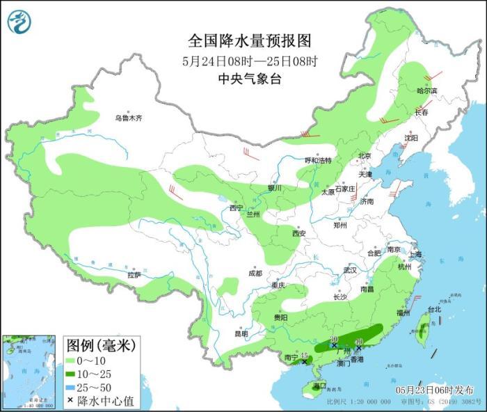 5月24日08時至25日08時,內(nèi)蒙古中東部、東北地區(qū)西部、新疆伊犁河谷和南部、西北地區(qū)中東部、華北北部、江南東部和南部、西南地區(qū)東部、華南、臺灣島等地部分地區(qū)有小到中雨,其中,廣東中南部等地局地有大雨(25~40毫米)。內(nèi)蒙古、東北地區(qū)、華北東部、黃淮東部等地部分地區(qū)有4~6級風,其中,內(nèi)蒙古西部部分地區(qū)有6~7級風。
