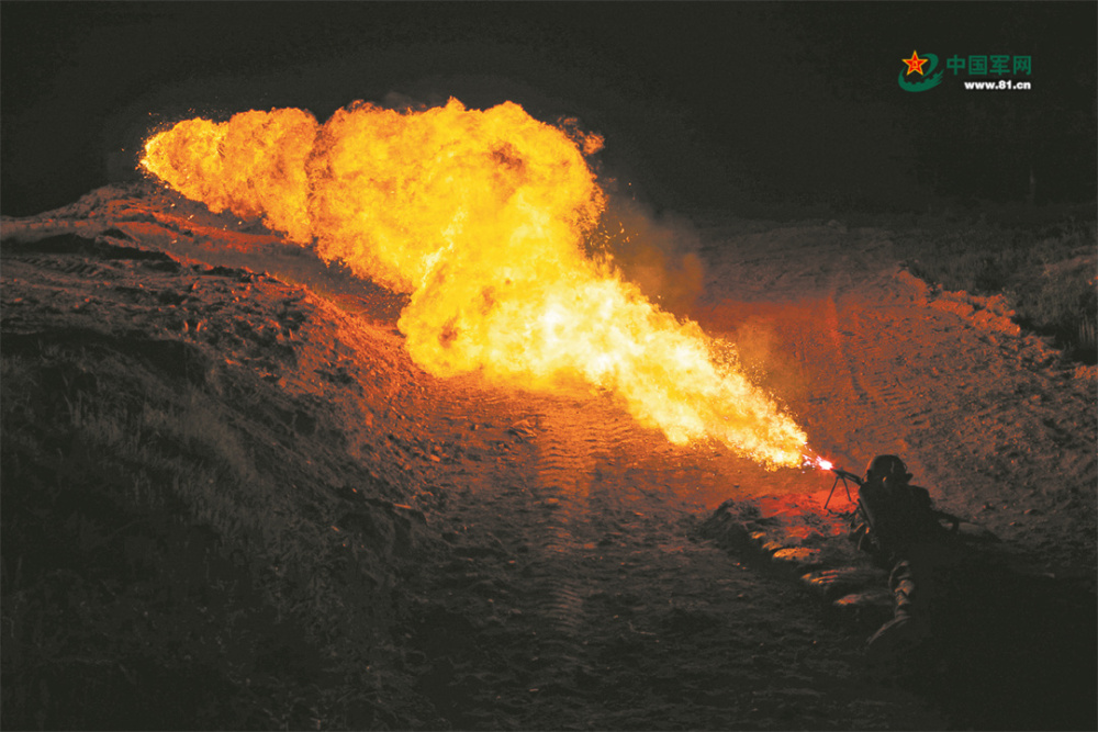 陸軍某旅組織防化分隊(duì)開展夜間噴火器實(shí)噴訓(xùn)練。萬智奇 攝