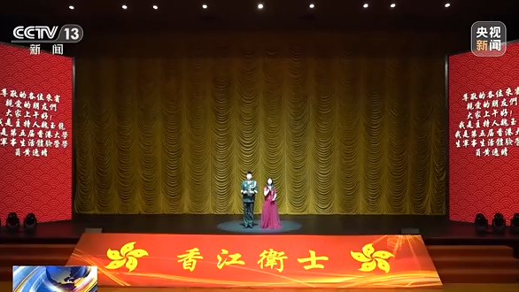 《香江衛(wèi)士》主題文藝演出舞臺(tái)上,身著紅色禮服的香港女孩黃逸晴與駐軍官兵同臺(tái)主持。黃逸晴是2015年香港大學(xué)生軍事生活體驗(yàn)營的學(xué)員,大學(xué)畢業(yè)后,她經(jīng)常從事社會(huì)公益工作,把愛國精神、奉獻(xiàn)情懷傳遞給更多人。