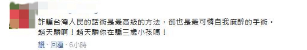 也有臺灣網(wǎng)友評論表示“果然是綠色邏輯思維,沒有最勇敢,只有最無知!”“趙天麟是在說相聲嗎?真愛鬼扯!”“詐騙臺灣人民的話術(shù)是最高級的方法,卻也是最可憐自我麻醉的手術(shù)!趙天麟啊!趙天麟你在騙三歲小孩嗎?”