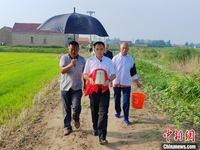 7月9日晨,劉德文手捧去臺老兵唐步良的骨灰,準(zhǔn)備將其安葬在江蘇鹽城市射陽縣興橋鎮(zhèn)青華村青華公墓。這里是唐步良父母的長眠之地。 中新社記者 谷華 攝
