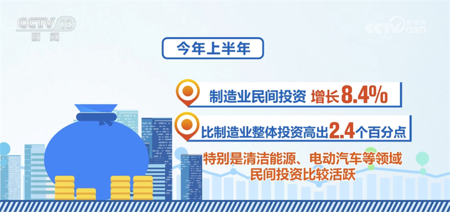 國(guó)家發(fā)展改革委相關(guān)負(fù)責(zé)人表示,當(dāng)前,民間投資結(jié)構(gòu)持續(xù)優(yōu)化,一些領(lǐng)域民間投資顯現(xiàn)了不少亮點(diǎn)。今年上半年,除房地產(chǎn)開(kāi)發(fā)以外的民間投資同比增長(zhǎng)9.4%,增速比全部投資高5.6個(gè)百分點(diǎn);制造業(yè)民間投資增長(zhǎng)8.4%,比制造業(yè)整體投資高出2.4個(gè)百分點(diǎn),特別是清潔能源、電動(dòng)汽車(chē)等領(lǐng)域民間投資比較活躍;基礎(chǔ)設(shè)施民間投資增長(zhǎng)15.6%,比基礎(chǔ)設(shè)施整體投資高出8.4個(gè)百分點(diǎn),呈現(xiàn)出較強(qiáng)的投資信心和投資動(dòng)力。