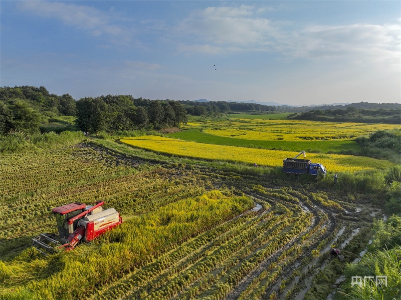 記者在現(xiàn)場看到,連片農田金燦燦的是再生稻,青綠色的是一季晚稻,青黃相間,非常漂亮。前些天下了場雨,眼看著到手的稻谷出現(xiàn)倒伏,徐宇等不及田塊干爽,便與兒子一起駕駛農機開始收割。