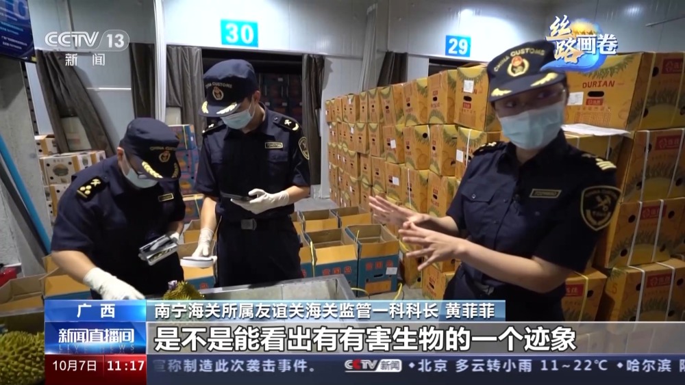南寧海關(guān)所屬友誼關(guān)海關(guān)監(jiān)管一科科長 黃菲菲:現(xiàn)在他們主要查驗的就是榴蓮的外表面,是不是能看出有有害生物的一個跡象。當(dāng)然他們同時還會對貨證相符性和證證相符性進行一個全面的檢查。比如說您看這個就是越南方面開出來的植物檢疫證書,就是為了保證榴蓮又快又好地進入國內(nèi)市場,然后讓我們的消費者能夠安心地食用。