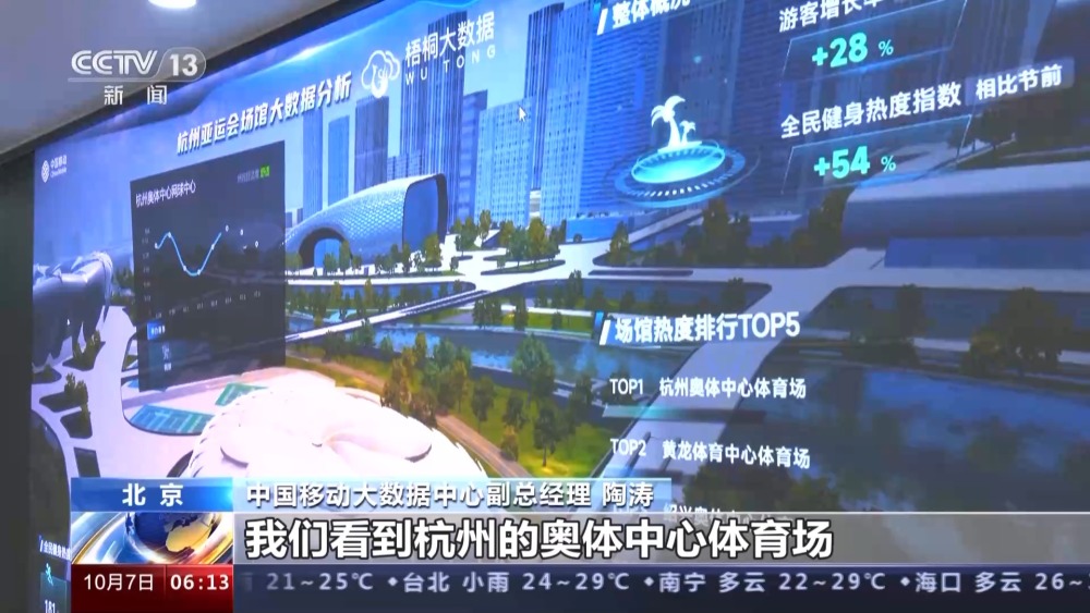 中國(guó)移動(dòng)大數(shù)據(jù)中心副總經(jīng)理 陶濤:前往亞運(yùn)會(huì)主要舉辦城市的游客的數(shù)量相比節(jié)前一周日均增幅超過(guò)28%,主要是來(lái)自長(zhǎng)三角地區(qū)以及津京冀等地區(qū)。根據(jù)我們對(duì)于線(xiàn)上訂票以及搜索這些數(shù)據(jù)的分析,我們看到杭州的奧體中心體育場(chǎng)、黃龍?bào)w育中心體育場(chǎng)以及紹興奧體中心體育館這三個(gè)場(chǎng)館是最熱的體育場(chǎng)館。