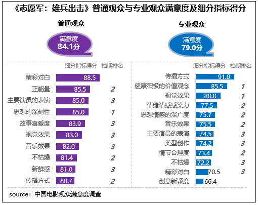 陳凱歌執(zhí)導(dǎo)的抗美援朝題材影片《志愿軍:雄兵出擊》觀眾滿意度83.8分,影片主題立意與國(guó)慶氛圍貼合,思想性得分85.0分,影片全景式呈現(xiàn)抗美援朝歷史,所傳遞的愛國(guó)精神和英雄氣概震撼人心,有85%的受訪觀眾表示在觀賞影片后感動(dòng)不已。